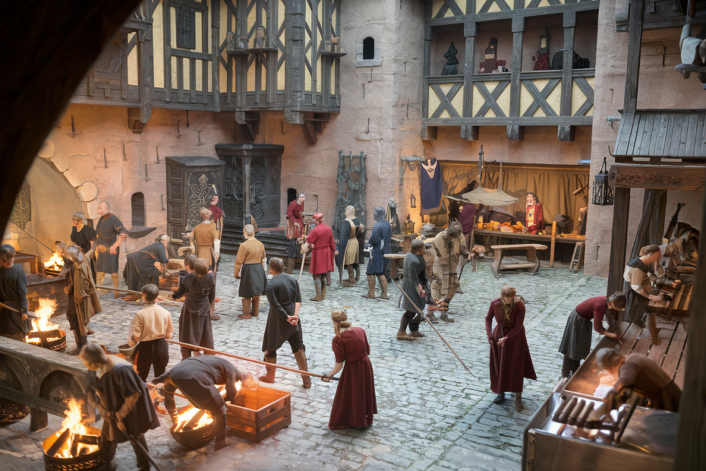 Im Tagesverlauf wurde die Burg zum lebhaftesten Ort überhaupt. Da war die Küche, die wie ein kleiner Vulkan brodelte – Köche, die Wild zerlegten, Brot backten, riesige Kessel rührten. Der Schmied hämmerte fast ununterbrochen. Wenn du das Geräusch einmal gehört hast, verstehst du, warum mittelalterliche Menschen vermutlich nie „absolute Ruhe“ kannten. Der Schreiber saß irgendwo im Halbdunkeln und kopierte Dokumente oder führte Rechnungsbücher. Und die Wachen liefen ihre Runden, prüften Tore, kontrollierten Besucher. Einer hat mal in einer Quelle geschrieben, dass die Wache „eine Kunst des Nicht-Einschlafens“ war – fühl ich komplett.