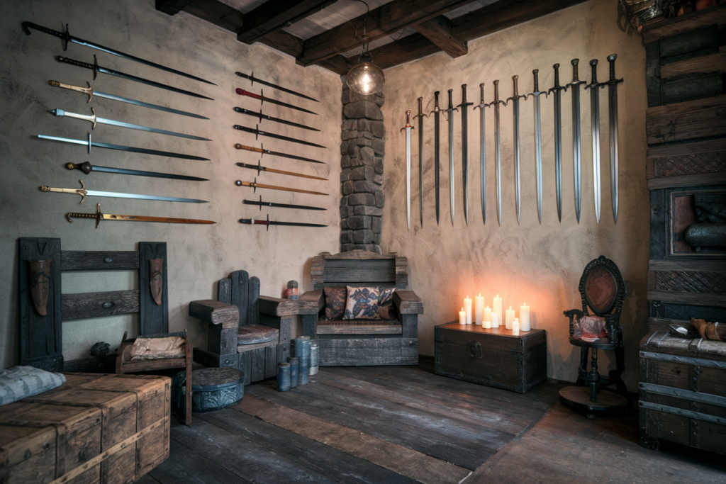 Der Klassiker: zu viele Waffen an der Wand. Ich dachte wirklich, Schwerter und Schilde seien das Herzstück jeder mittelalterlichen Einrichtung. Also wurden gleich mehrere Stücke bestellt. Das Ergebnis? Mein Wohnzimmer sah aus wie ein kleiner Themenpark. Mittelalter Dekoration lebt von Atmosphäre, nicht von Übertreibung. Ein einzelnes, hochwertiges Schwert oder ein stilvolles Wappen reicht völlig aus. Alles andere wirkt schnell nach Ritterklischee statt nach authentischem Wohnstil.